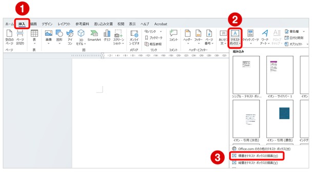 【挿入】タブ→【テキスト】グループ→【テキストボックス】をクリックし【横書きテキストボックス】(または【縦書きテキストボックス】)を選択します。
